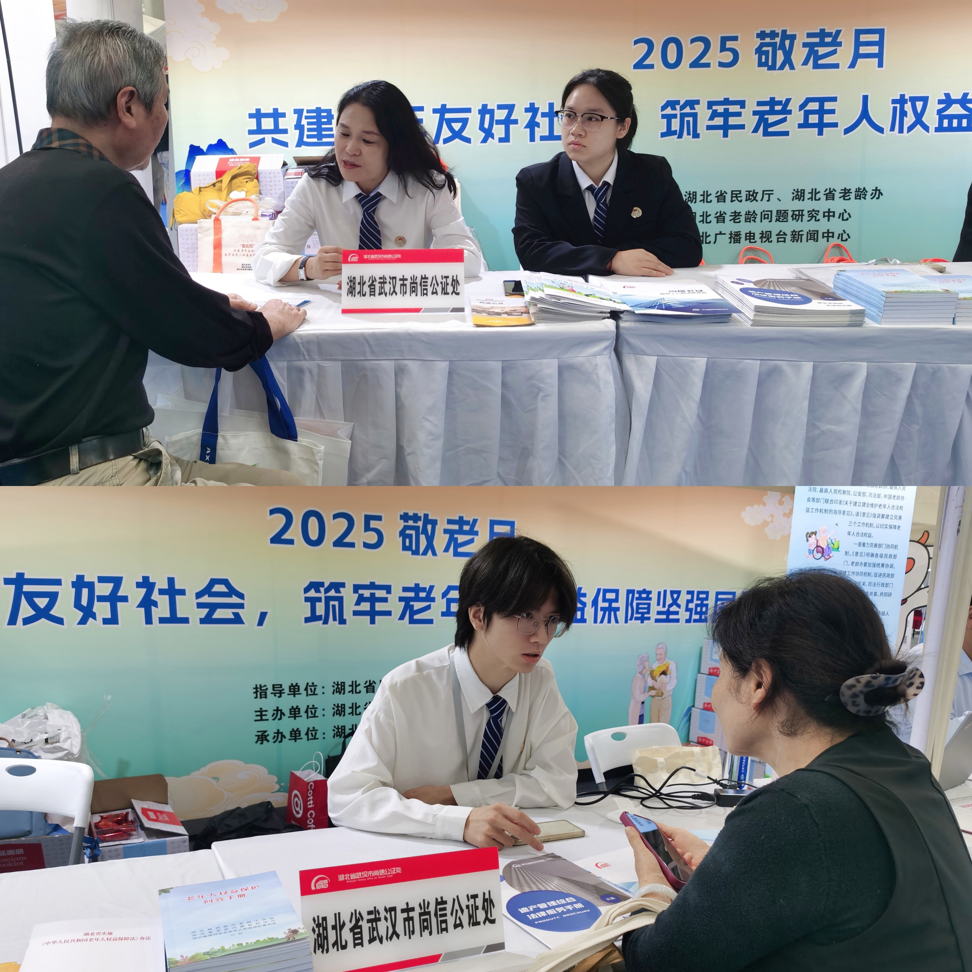 湖北省武汉市尚信公证处与律所工作人员共同坐镇“老年人权益咨询台”,为老年人撑起“法律保护伞”。围绕遗嘱传承、意定监护、生前预嘱、防诈公证四大板块,公证处不仅解答疑问,更用实际案例让老年人感受到法律的温度。